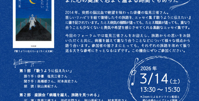 2026年3月14日(土)開催のNPOがんサバネット設立5周年記念フォーラム 「歌うように伝えたい~旅路からの思い」の参加申込を開始しました。 「生き残った時間は壮絶であったが、また心の奥深く芯まで温